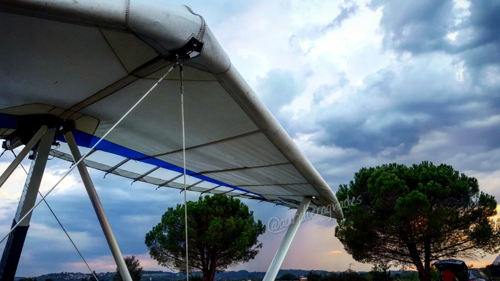 Et puis mercredi ce message subliminal de ma cousine. Là encore rien n'était sur. Il a fait beau et très chaud toute la journée. J'ai veillé le ciel et mon téléphone. Et un peu après 18h30 la confirmation. Celle tant attendue ! Celle qui m'a fait poussé un Hiiiiiiiiiiiiiiiiiiiiiiiiiiiii du fond du coeur !!! J'ai embarqué de quoi me couvrir, mon appareil photo et je suis partie direction la base ULM de Pommevic, à pas très loin de chez moi. Sur le trajet j'ai appelé mon rabat joie. J'ai suivi mon GPS et je suis arrivée la première. Ma cousine étant sur le trajet pour me rejoindre car elle aussi devait s'envoyer en l'air en presque même temps que moi.